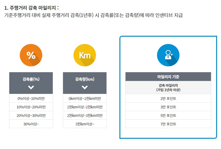 주행 거리 감축 마일리지는 기준 주행 거리 대비 실제 주행 거리를 1년 후 감축률에 따라서 인센티브를 지급하게 되네요.