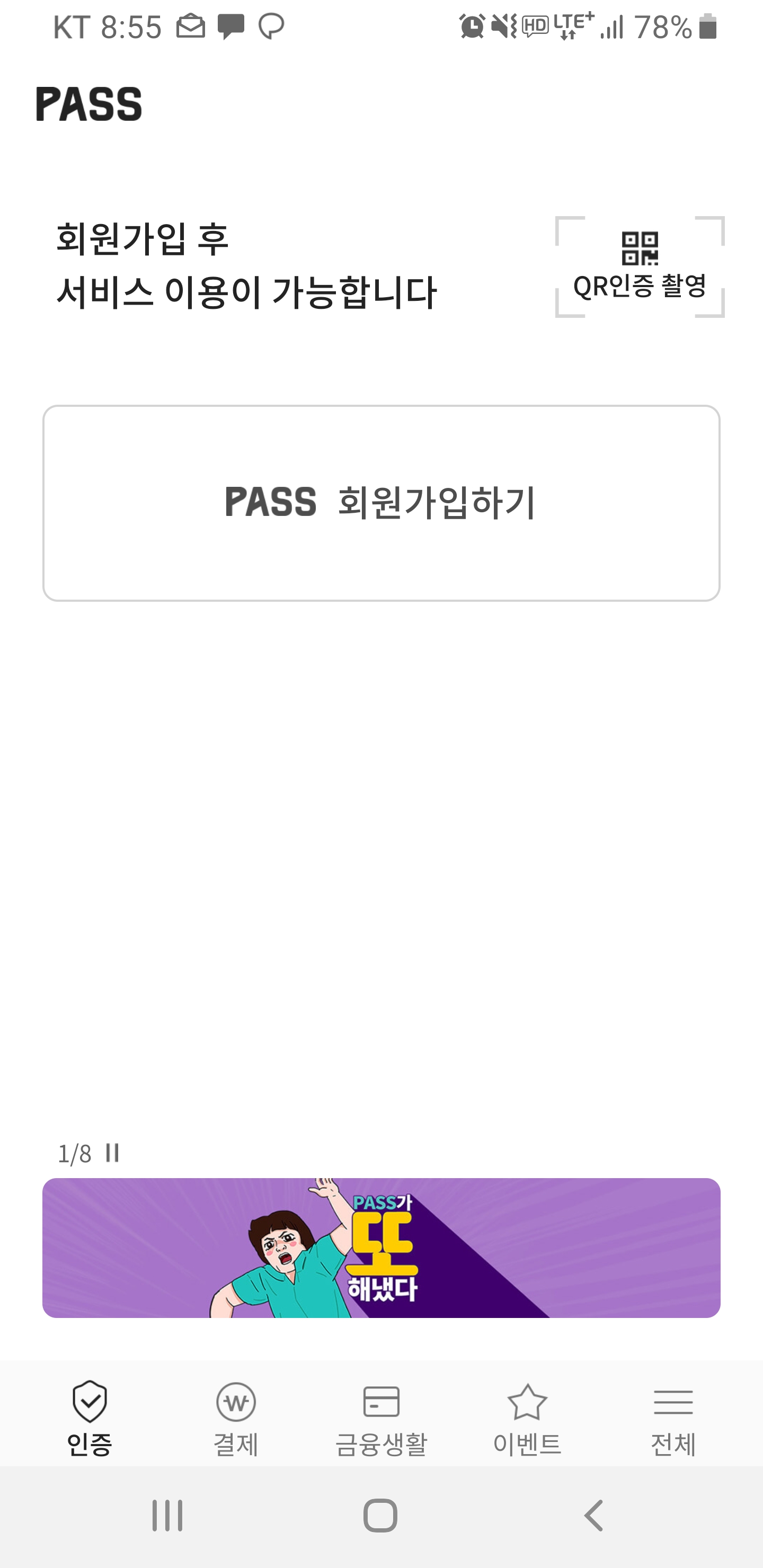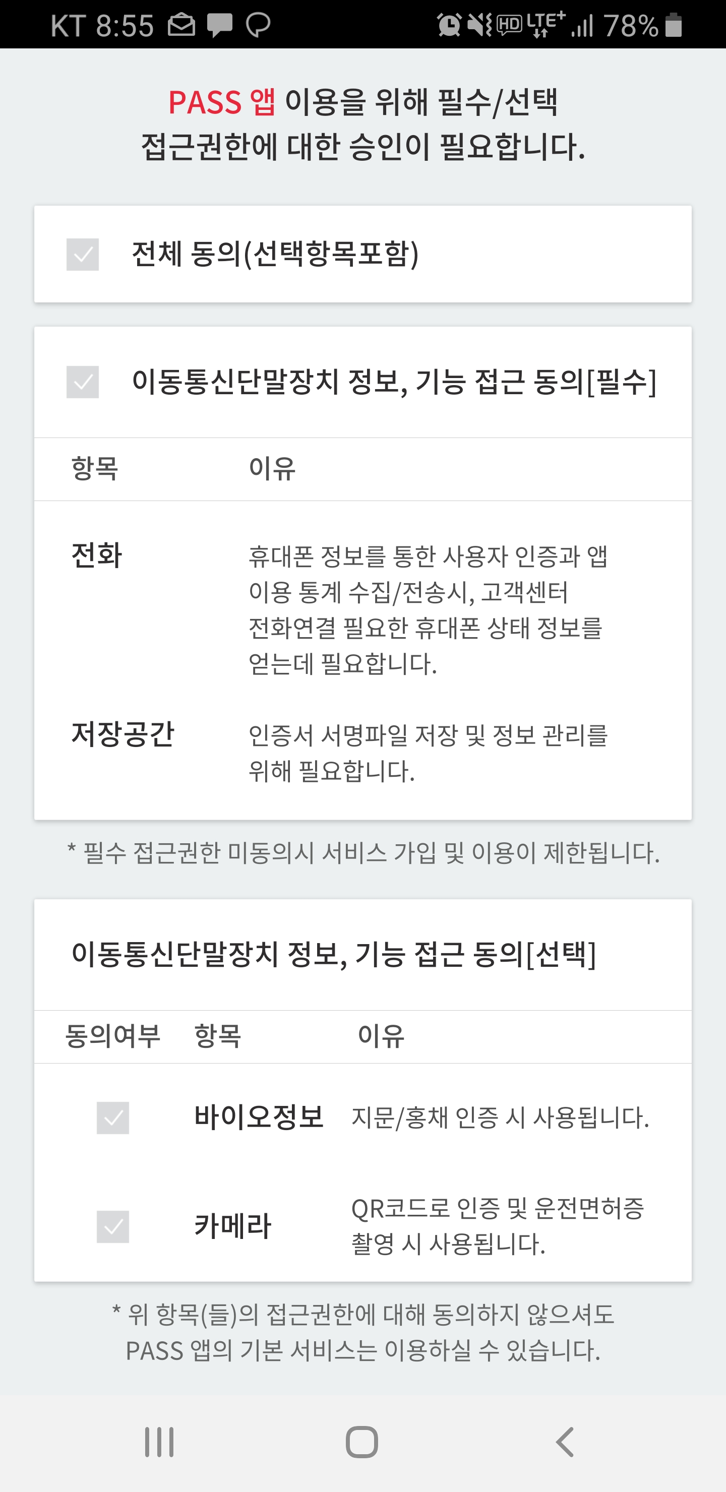 PASS 앱을 이용을 위해서 PASS 앱 가입을 우선 하셔야 합니다. 우선 아래 화면에서 PASS 회원 가입 하기를 누르세요 그리고 회원 가입을 진행하셔야 합니다. PASS 앱의 서비스 약관을 우선 동의하셔야 합니다. 그리고 나면 이용 권한 신청 화면이 나오게 됩니다. 사용을 위해서는 동의를 누르지 않을 수 없네요. PASS 앱 이용을 위해서는 필수로 접근 권한에 대한 승인 이 필요하네요. 전체 동의(선택항목 포함)를 선택하시거나, 아니면, 선택 중에 본인이 거부하고 싶은 항목은 제외하고 필수항목만 선택해주세요. 항목은 저장공간 및 전화 부분입니다. 저는 귀찮아서 전체 동의를 선택하고 마무리했습니다.