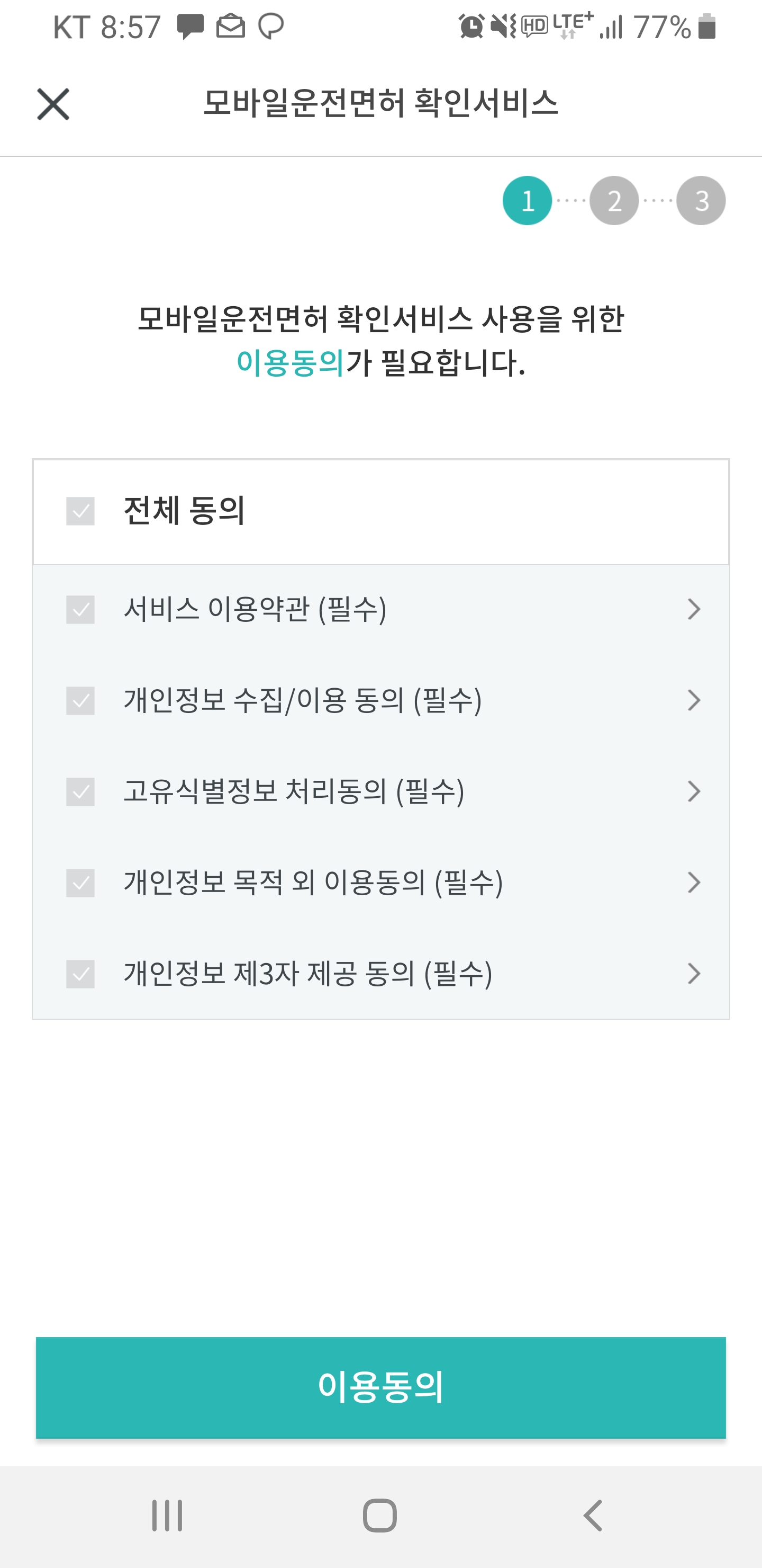 모바일 운전 면허증 발급을 위해서는 이제 동의가 필요합니다. 저 같은 경우는 전체 동의를 눌러서 동의 진행합니다. 귀찮아서요 하지만 꼭 필요한 항목만 동의하는 게 아무래도 좋겠죠 선택 후 동의 버튼을 눌러 주세요.