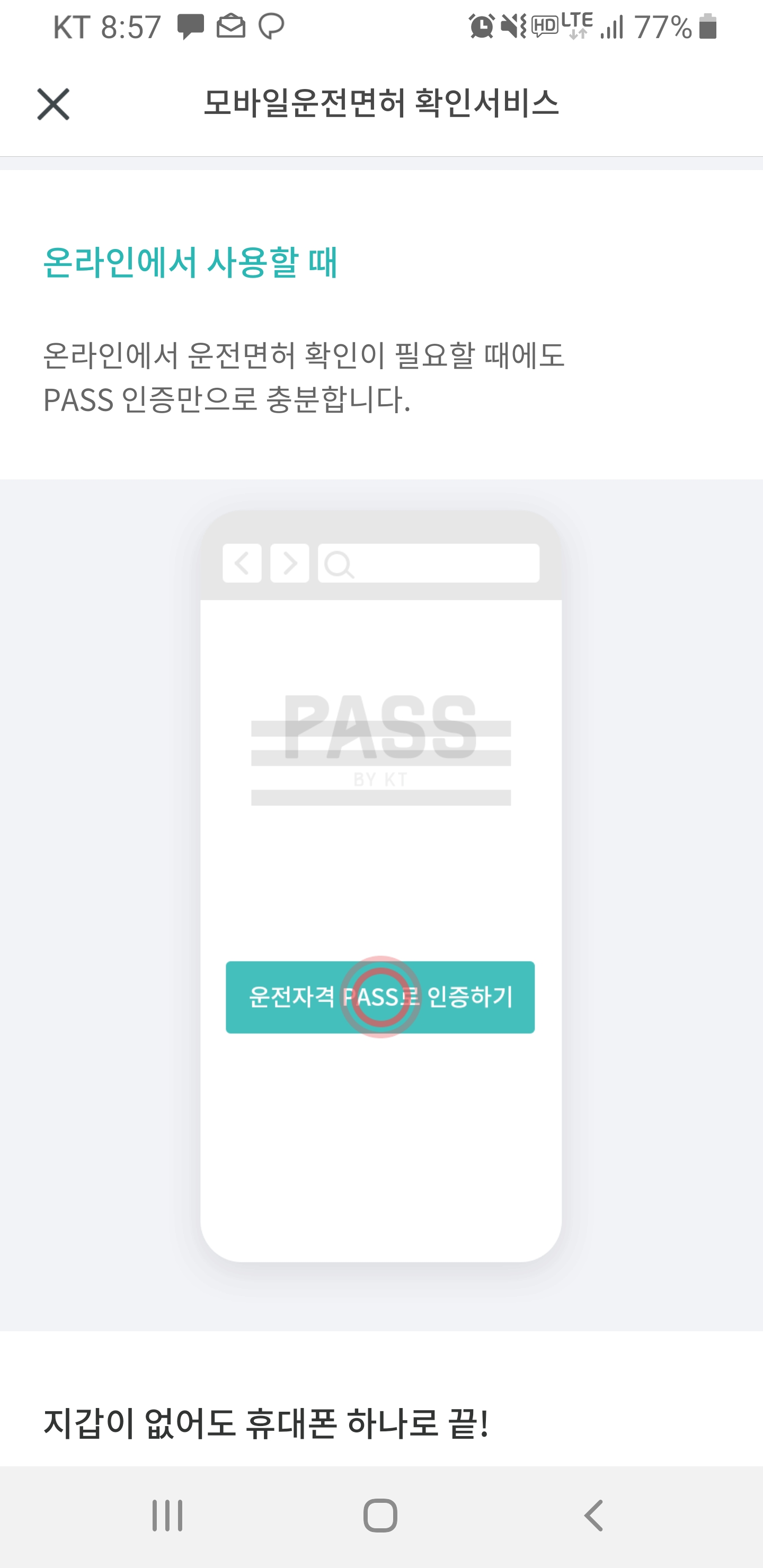 저 같은 경우는 KT PASS를 설치했습니다. 통신사가 KT 알뜰 폰이라서요 알뜰폰도 설치가 가능하더라고요. 어플 이름을 PASS BY KT입니다. 운전면허증이라는 부재가 붙어 있네요. 우선 설치를 진행하세요.