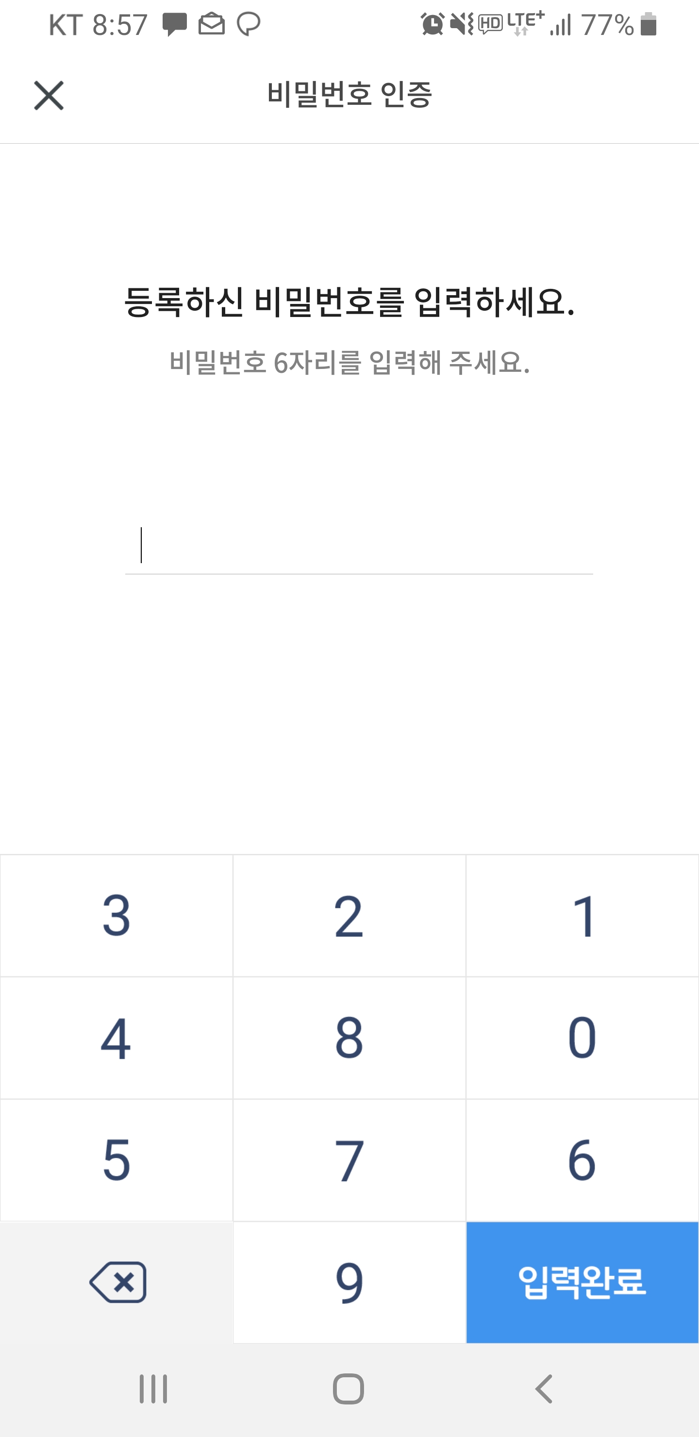 다음 화면에서는 비밀번호 인증을 진행 하시면 됩니다. 이전에 입력했던 비밀 번호를 입력해서 인증을 진행해주세요. 생각보다 어렵지 않죠 숫자로 되어 있을 겁니다.