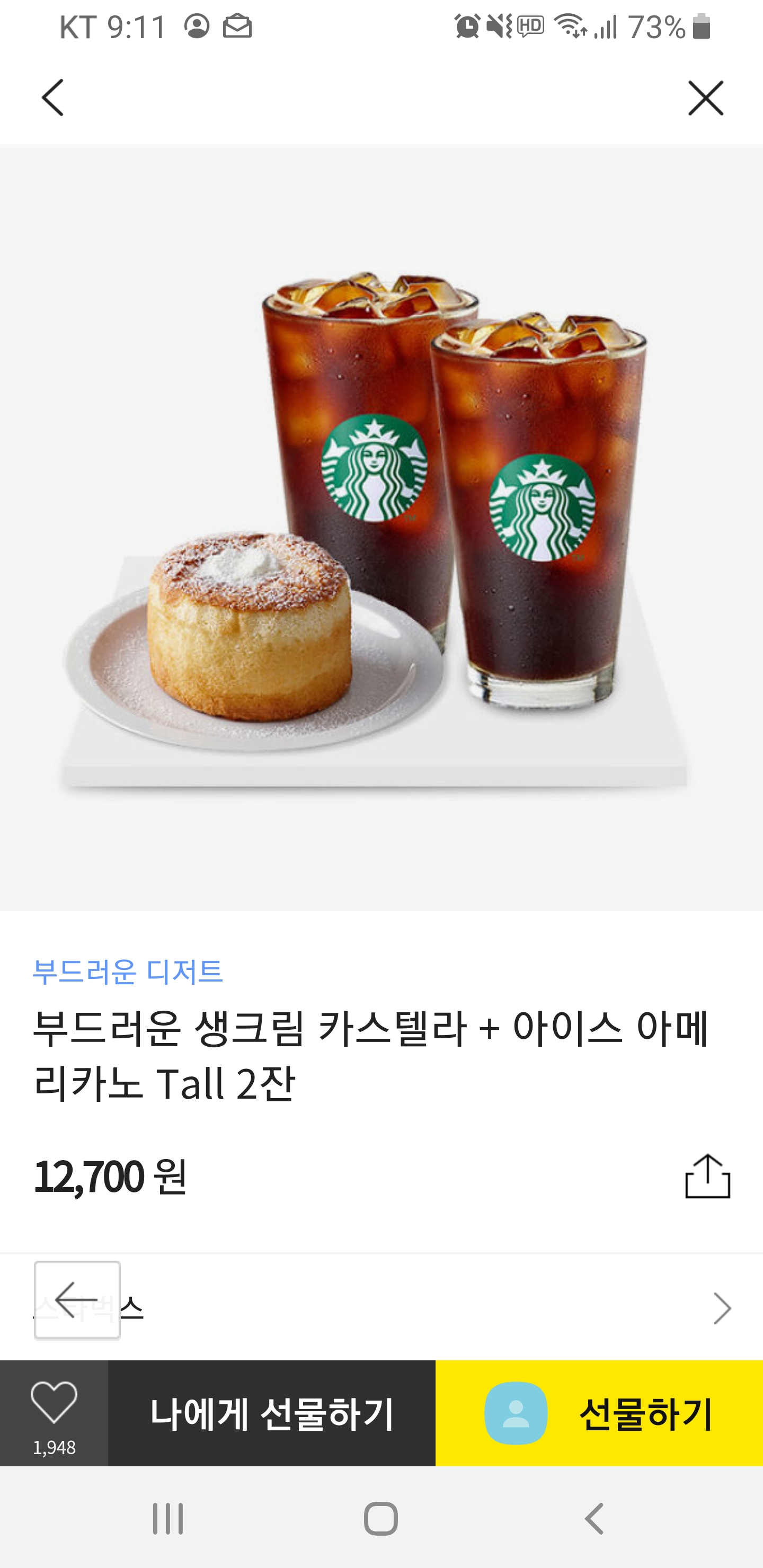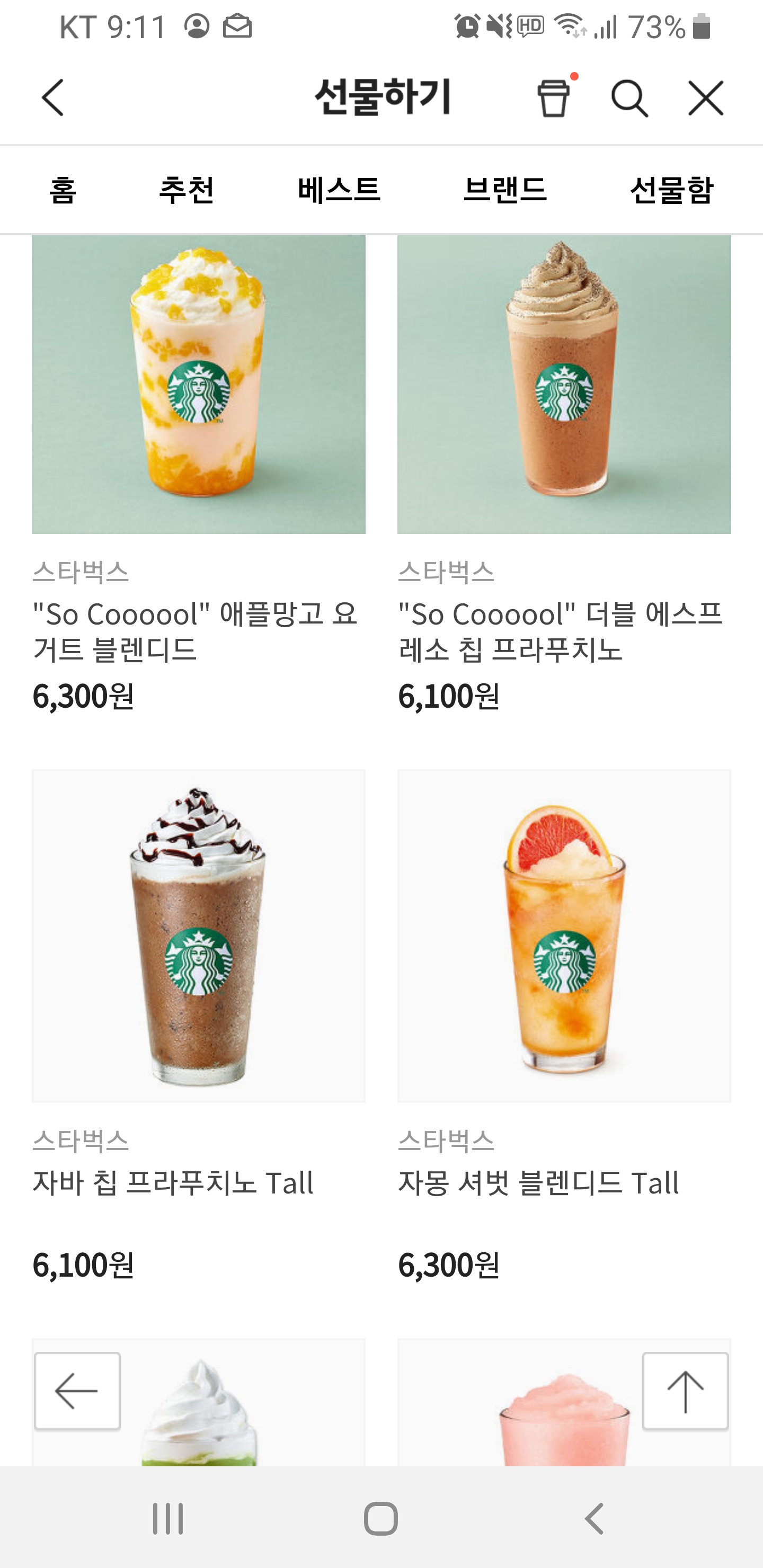 제가 보기에는 아이스 카페 아메리카노 tall 이 가장 눈에 띄네요. 요즘같은 여름 시즌에 괜찮은 아이템인 것 같습니다. 그런데 선물하기에는 조금 가격이 저렴한 것 같네요. 편하게 지인에게 한잔씩 돌리는 것도 나쁘지 않겠지만 생일 선물로는 너무 저렴한 것 같아 조금 고민이 되는 것 같습니다. 그래서 스크롤을 내려 보니, 부드러운 디저트, 부드러운 생크림 카스텔라와 아이스 카페 아메리카노 tall도 역시 괜찮아 보입니다. e 카드 교환권 3만 원 권도 괜찮아 보이네요. 본인이 원하는 메뉴를 골라서 먹을 수 있을 테니 이것도 괜찮아 보이네요. 고민이 되네요.