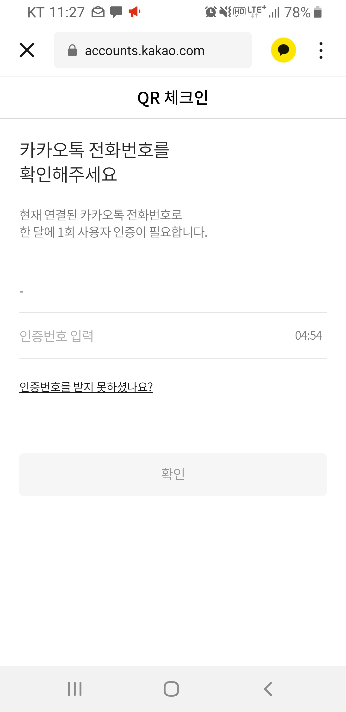 그렇게 동의를 누르게 되면 아래와 같이 카카오톡 전화번호를 확인해주세요 라는 화면을 확인할 수 있네요 현재 연결된 카카오톡 전화번호로 한 달에 1회 사용자 인증이 필요하다고 나오네요 기존 매번 인증하는 것보다는 훨씬 편리해진 것 같네요. 본인의 전화번호가 자동으로 입력되게 됩니다. 그 후 인증 요청 아이콘을 클릭해주세요 그다음 버튼을 클릭해주세요.