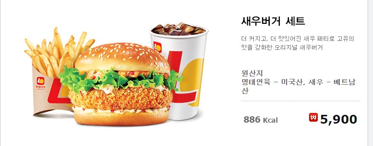 더 커지고, 더 맛있어진 새우 패티로 고유의 맛을 강화한 오리지널 새우버거 세트 메뉴입니다. 유명한 롯데리아 새우버거 세트이네요 원산지는 명태 연육 - 미국산, 새우 - 베트남산이네요.
