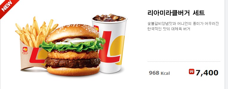 숯불갈비양념 맛과 어니언의 풍미가 어우러진 한국적인 맛의 대체육 버거입니다. 968Kcal이네요.