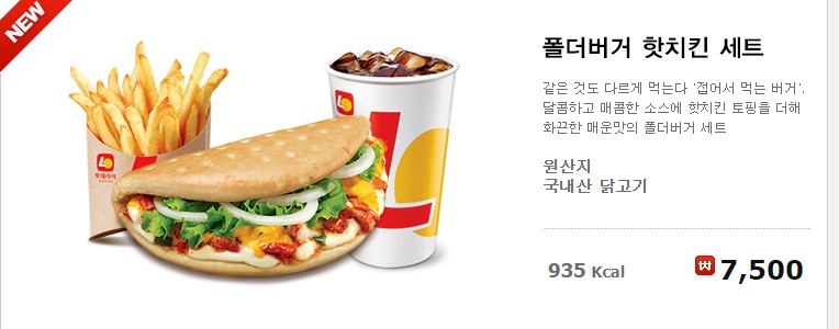 같은 것도 다르게 먹는다 '접어서 먹는 버거'. 달콤하고 매콤한 소스에 핫치킨 토핑을 더해 화끈한 매운맛의 폴더 버거 세트 원산지 국내산 닭고기 935Kcal이네요