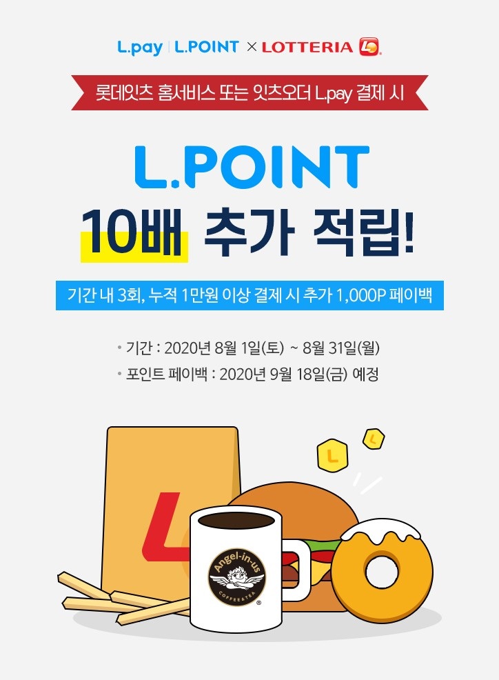 롯데리아에서는 8월 한 달 동안 기간동안 롯데 잇츠 홈서비스 또는 잇츠 오더 L pay 로 결재 3회 1만원 이상 구매시에는엘 포인트를 기존 대비 10배 추가 적립해 준다고 하네요 8월 한달 동안 이용 가능하고 햄버거 딜리버리 배달 시에나 롯데리아 주문 시에 이러한 행사를 활용해서 좀 더 알뜰하게 햄버거를 즐기셨으면 좋겠습니다. 롯데리아에서 할인 행사를 많이 하고 있네요.