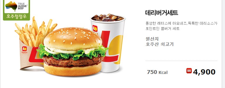 풍성한 레터스에 마요네즈, 독특한 데리소스가 포인트인 햄버거 세트입니다. 원산지는 호주산 쇠고기 750Kcal이네요 롯데리아에서 유명한 세트 중 하나이네요.