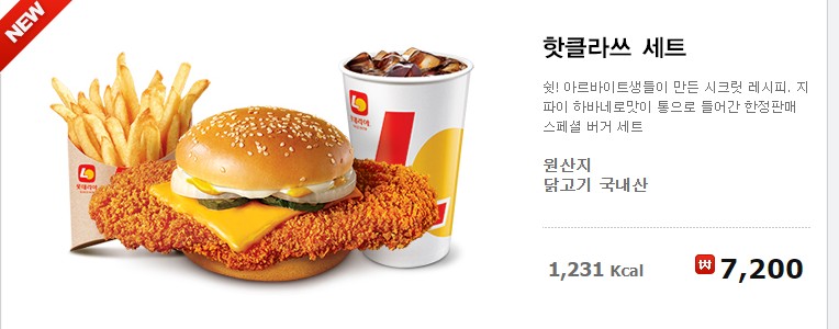 쉿! 아르바이트생들이 만든 시크릿 레시피. 지팡이 하바네로 맛이 통으로 들어간 한정 판매 스페셜 버거 세트입니다. 원산지 닭고기 국내산 1,231Kcal 네요