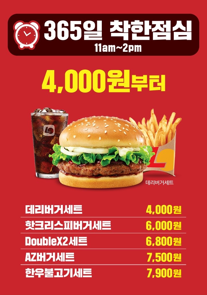 이제 요즘에 진행하고 있는 365일 착한 점심 행사입니다. 시간은 11시부터 오후 2시까지 진행하게 되고 햄버거 메뉴 중 추천 메뉴를 선정해서 할인 행사를 하고 있네요. 데리버거 세트 4000원, 핫 크리스피 버거 세트 6000원, 더블 x2 세트 6800원, AZ 버거 세트 7500원, 한우 불고기 세트 7900원 에 판매하고 있습니다. 점심식사를 롯데리아에서 하시길 원하시는 아래 롯데리아 메뉴 중에 선택해서 구매하시는 것도 좋아 보입니다. 아래 본 롯데리아 착한 점심메뉴에 대해서 좀 더 상세히 정리해 보았습니다. 저도 주말이나 시간 날 때는 이러한 롯데리아 착한 점심 이벤트를 이용해서 저렴하게 햄버거 메뉴를 즐기고 있습니다. 아래 11시부터 2시까지 행사 시간을 꼭 참고해서 저렴하게 햄버거를 즐겨 보세요.