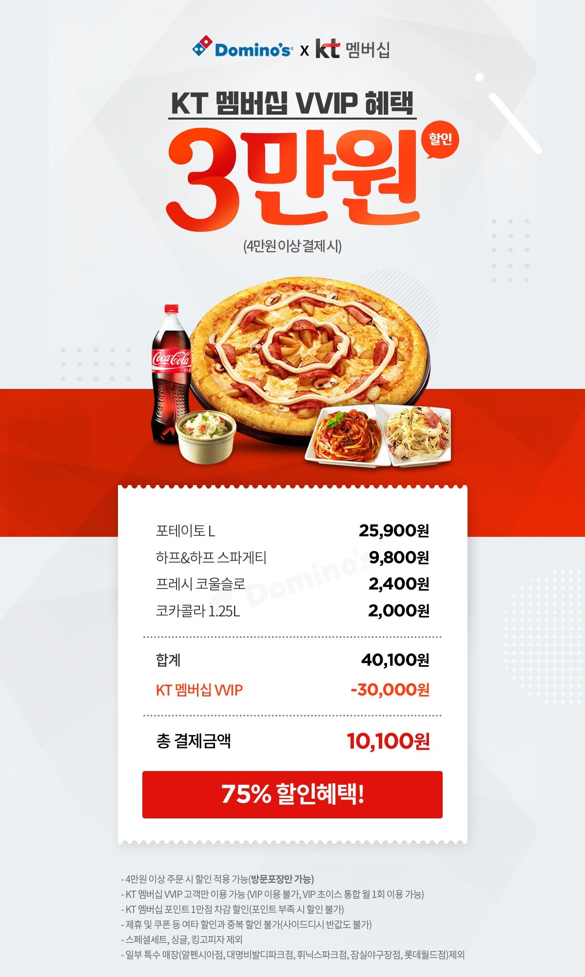 대상은 KT 멤버십 회원중 VVIP가 그 대상이고요. 4만 원 이상 결재할 경우에 3만 원을 할인해 주는 혜택을 주고 있네요. 포테이토 피자 라지 , 하프 하프 스파게티, 프레시 코울슬로 콜라 1.25 L 구매 시에 3만 원 할인하여 10,100원에 구매 하루 있게 할인 혜택을 주고 있네요. KT 멤버십 포인트는 1포인트가 차감하여 할인되며, 제휴 여타 쿠폰과 중복 할인은 불가하네요. 방문 포장만 가능하다고 하네요. 스페셜 세트, 싱글, 킹고 피자는 제외되네요. 맛있는 피자인 도미노 피자 주문 시 아래 혜택을 활용해 보세요.