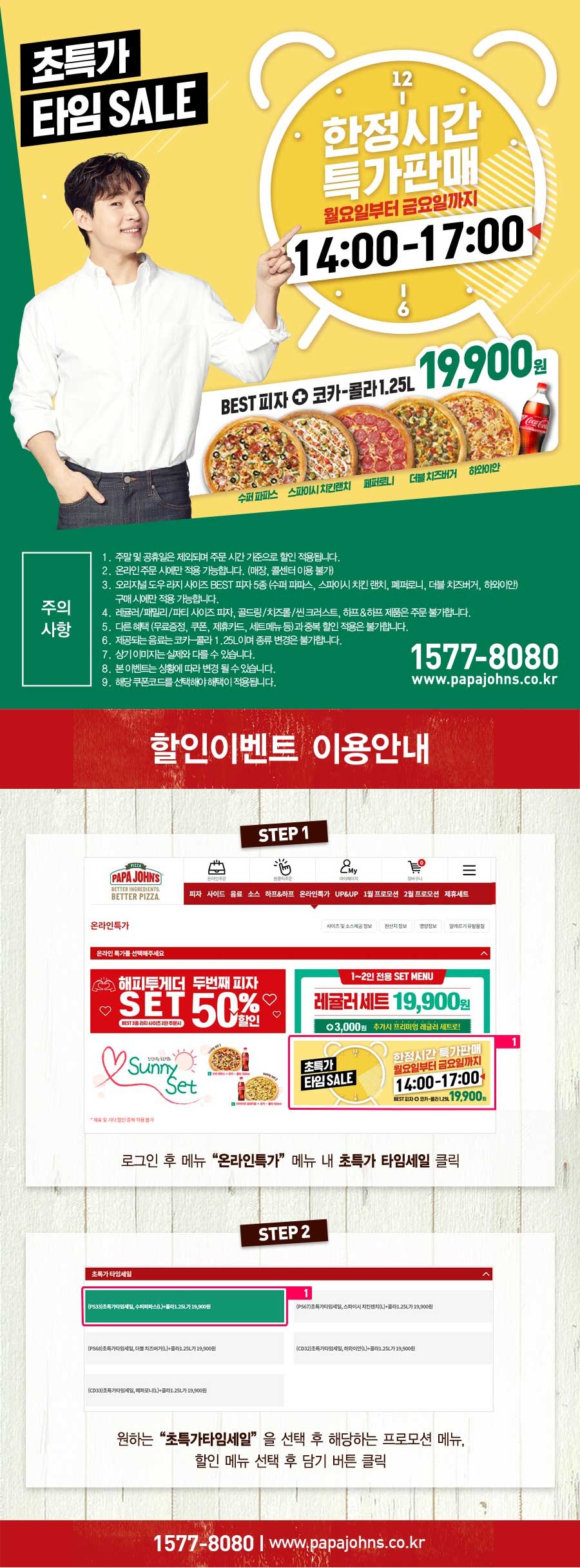 파파존스에서는 매주 월요일부터 금요일까지 매일 14:00 ~17:00 한정 시간 특가 판매를 진행합니다. 베스트 피자:슈퍼 파파스 피자, 아이리쉬 포테이토 피자, 치킨 바비큐 피자, 스파이시 치킨 랜치 피자, 슈퍼 파파스 피자, 프리미엄 직화 불고기 피자, 존스 페이버릿 피자 (라지)와 콜라를 19900원에 즐길 수 있네요. 본 행사는 온라인 주문 시에만 적용되네요. 참고해주세요.