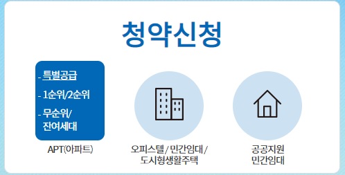 청약 신청 메뉴에서는 아파트(특별 공급, 1순위, 2순위, 무순위, 잔여세대), 오피스텔, 민간 임대, 도시형 생황 주택, 공공지원, 민간 임대 이런 식으로 구분하여 신청할 수 있습니다.