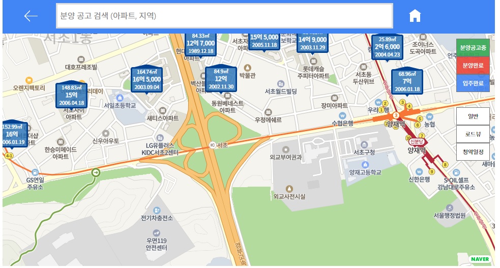 각종 청약 일정 및 지역 정보를 지도로 표시해서 보여주는 서비스도 있네요 우측 상단에 지도로 보기를 선택해주면 됩니다. 분양 공고 중, 분양 완료, 입주 완료된 아파트 정보를 손쉽게 보실 수 있습니다.