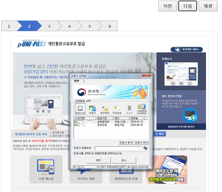 아래 화면은 공인 인증서를 통해서 본인 개인 통관 번호를 조회하는 화면입니다. 본인의 인증서를 선택한 후에 비밀번호를 입력해주세요.