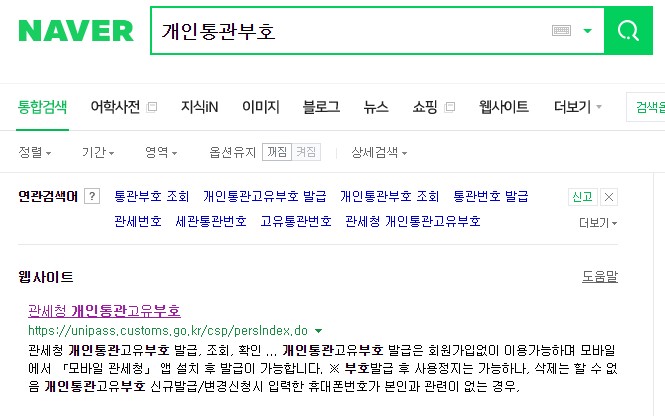 아래와 같이 네이버 등의 웹사이트에서 개인 통관 번호라고 입력해주세요. 처음 보이시는 관세청 개인 통관 고유 부호 웹사이트를 클릭해주세요.