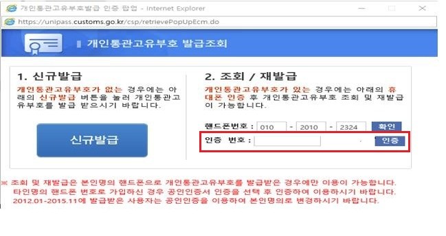 개인통관 고유번호 신청했던 화면에서 공인인증서 또는 휴대전화 문자메시지로 본인 확인 절차를 거쳐 확인할 수 있습니다.