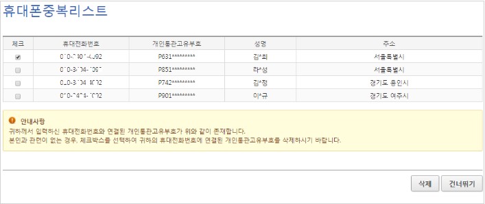 휴대폰 중복 리스트를 삭제 진행해주시고요 다음을 클릭해주세요.