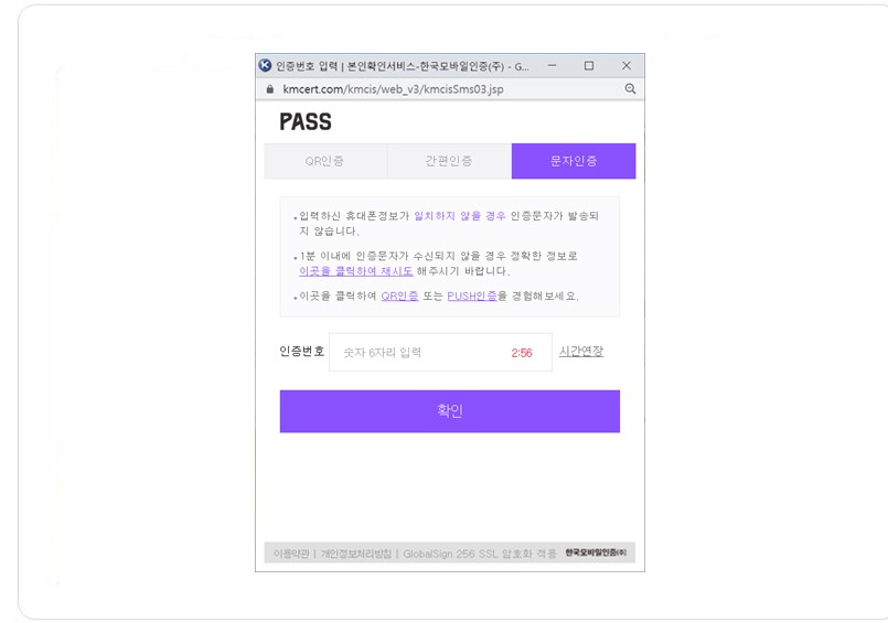 ⑤ 휴대폰으로 전송된 인증번호를 확인하여 인증번호 입력창에 입력하고 ‘확인’ 버튼 클릭하시고 인증번호를 입력해주세요.