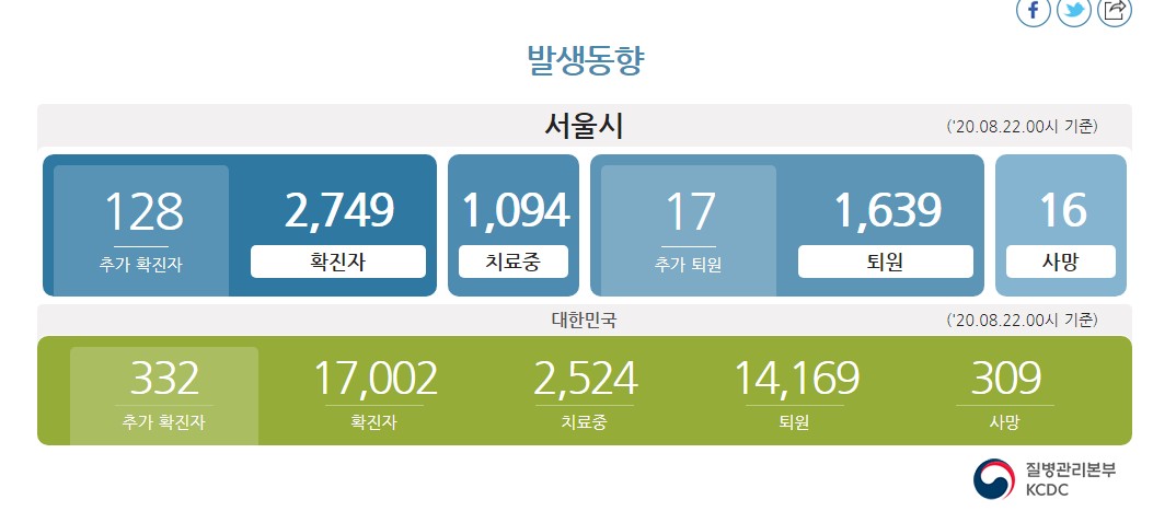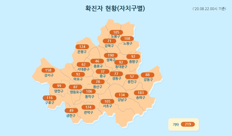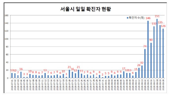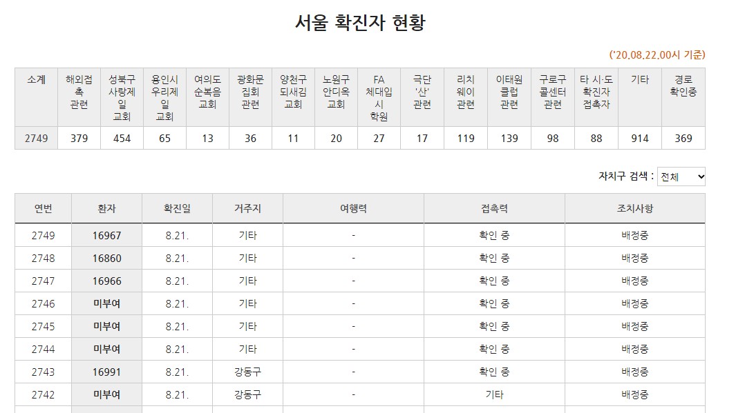 서울시는 8월 21일 0시 기준 코로나19 서울지역 확진환자는 전일 0시 대비 126명이 늘어서 2,621명으로, 983명이 격리 중이며, 현재 1,622명이 완치 판정을 받고 퇴원하였습니다. 신규 확진자 126명은 성북구 사랑 제일교회 관련 17명, 용인 우리 제일교회 2명, 영등포구 여의도 순복음교회 2명, 광화문 집회 관련 15명, 해외 접촉자 관련 1명, 타시도 확진자 접촉 12명, 기타 확진자 접촉 44명, 경로 확인 중 33명이네요 수시로 변경되니 아래 내용을 참고해주세요