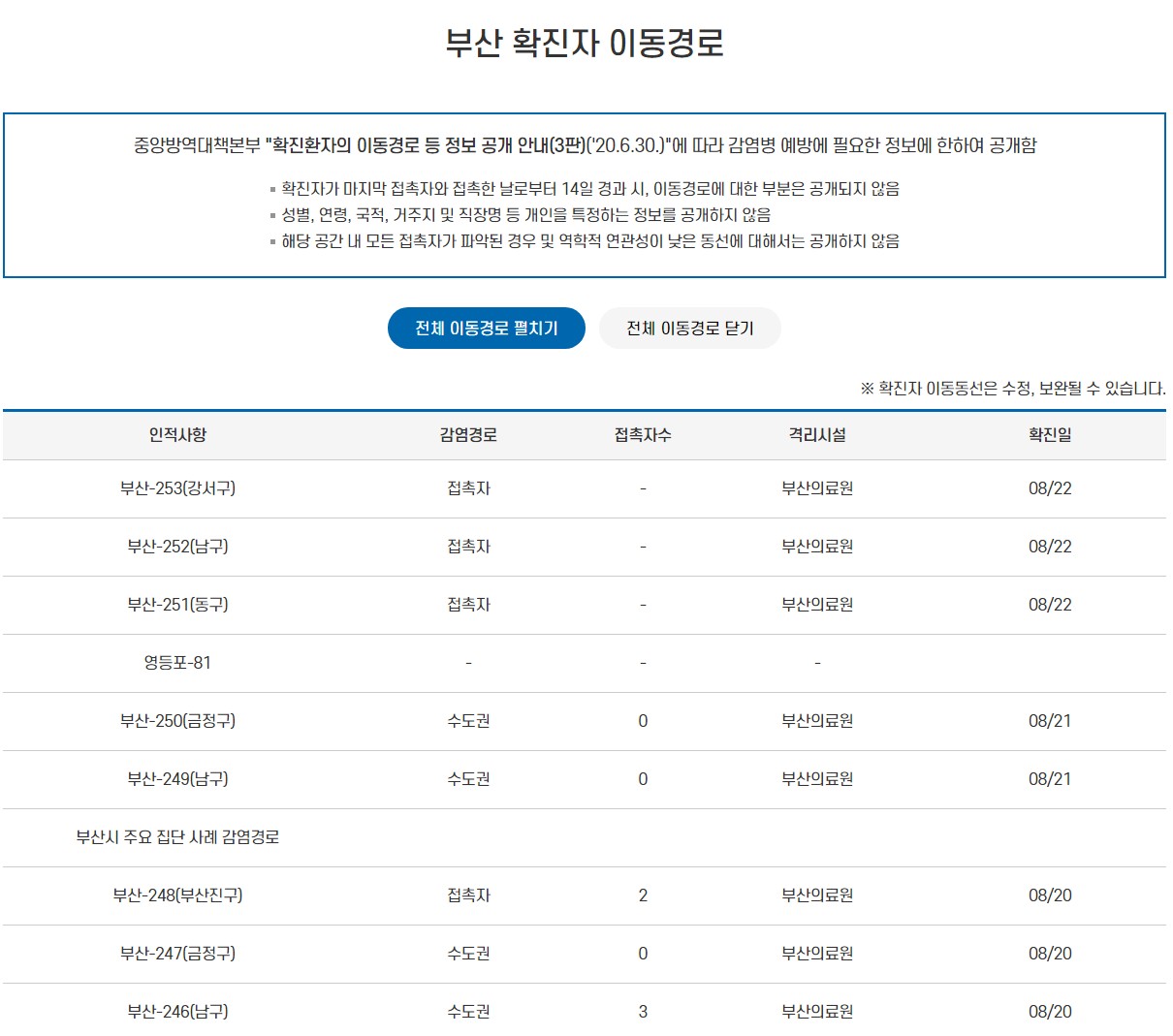 부산 확진자 이동경로 중앙방역대책본부 "확진환자의 이동경로 등 정보 공개 안내(3판)('20.6.30.)"에 따라 감염병 예방에 필요한 정보에 한하여 공개함 확진자가 마지막 접촉자와 접촉한 날로부터