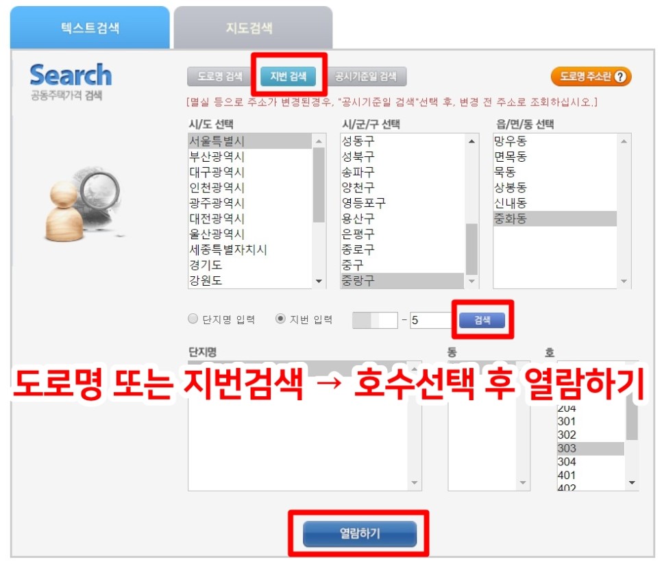지번 포함한 해당 부동산의 주소를 입력해 준후 해당 지번의 호수 번지수를 입력 해줍니다.