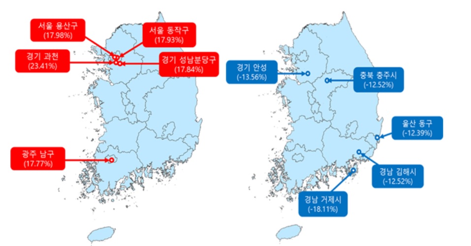 서울 강남, 과천, 분당, 그리고 광주 남구는 약 17% 이상의 공시 가격 상승이 이뤄졌다.