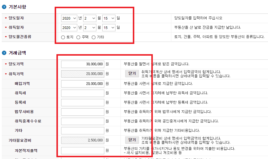 다음 화면에서 취득 일자, 양도 일자 및 부동산의 종류 그리고 매입 금액, 양도 금액 및 실세 사용한 비용을 입력해줍니다.