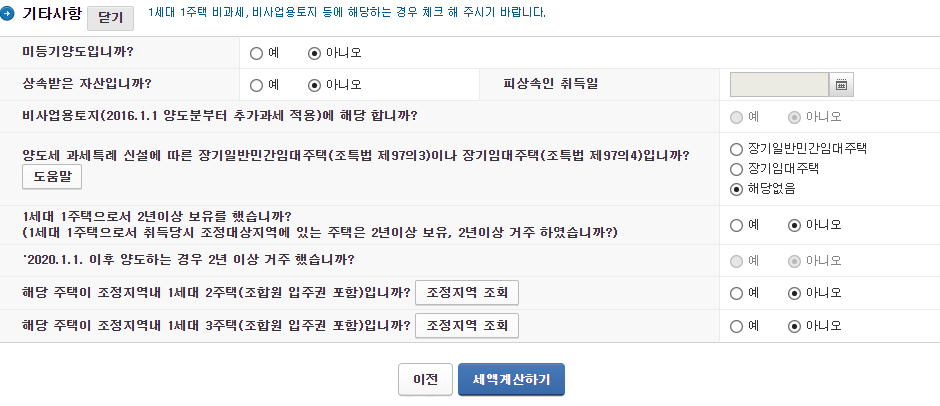 다음 기타 사항에 미등기 양도 상속 여부 비과세 대상인지 등등을 입력합니다.