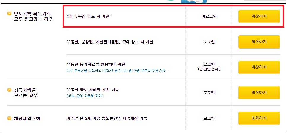 다음 메뉴에서 1개 부동산 양도 시 계산을 선택합니다.