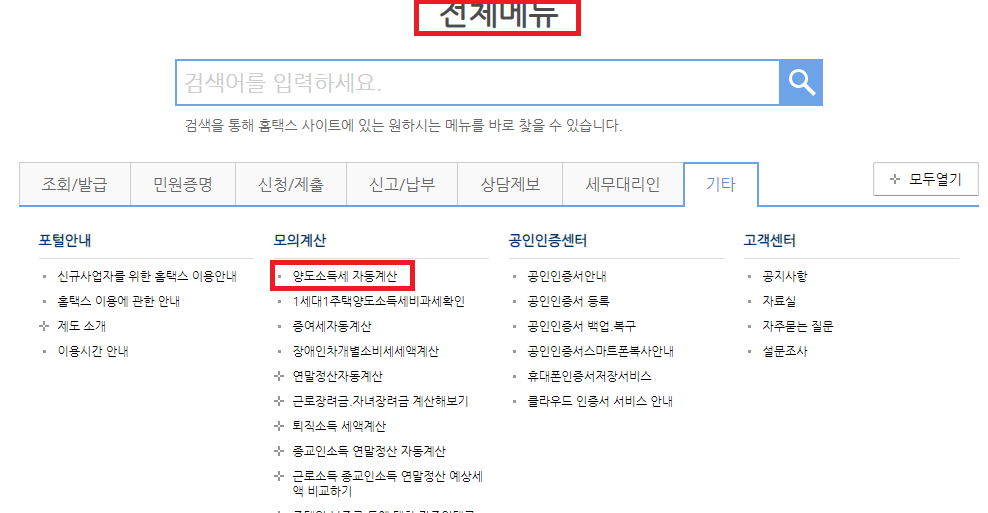 전체 메뉴에서 모의 계산 항목에 보시면 양도소득세 자동 계산 메뉴가 있습니다.