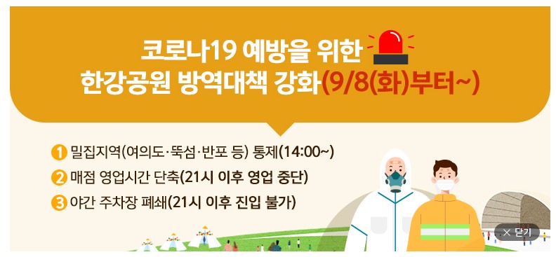 또한 한강 공원내 매점 28곳과 카페 7곳은 영업시간을 단축하고, 매일 9시에 문을 닫아 코로나 사태 안정을 위한
