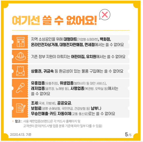 단, 백화점 및 대형마트, 온라인 쇼핑몰, 상품권 및 귀금속 판매 매장, 유흥‧레저‧사행업종, 조세 및 공공요금 납부 등은 사용 제한됩니다.