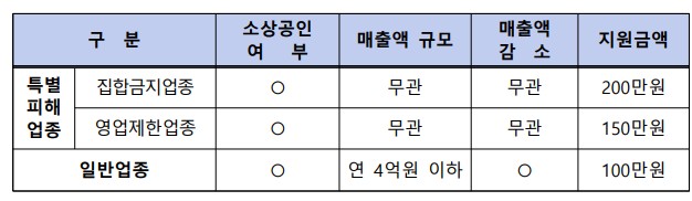 * 집합금지·영업제한업종은 매출액(4억원), 매출감소 여부와 무관하게 지원