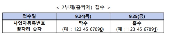 원활한 신청·접수를 위해 신청 첫날부터 다음날(9.24~9.25)까지는 2부제(홀짝제)로 접수하며 26일부터는 숫자와 상관없이 자유롭게 신청 할 수 있습니다.