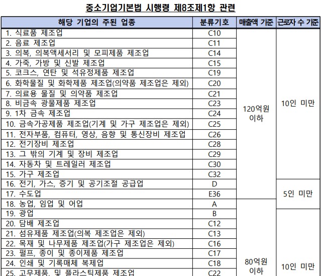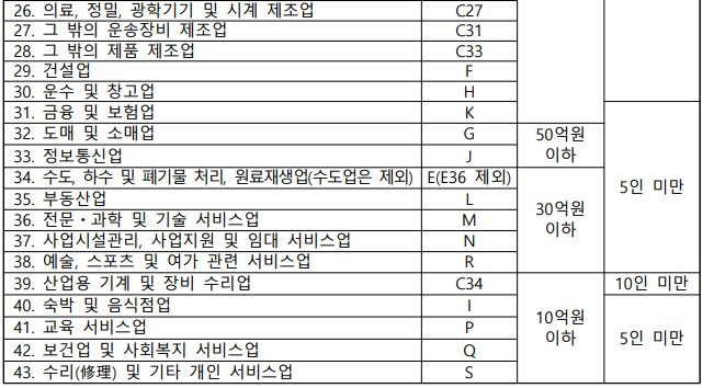 * 소기업 매출규모 기준(예) : 숙박‧음식점업 10억원 이하, 도‧소매업 50억원 이하 등 광업·제조업·건설업 및 운수업 : 10인 미만인 사업자 그 밖의 업종 : 5인 미만인 사업자
