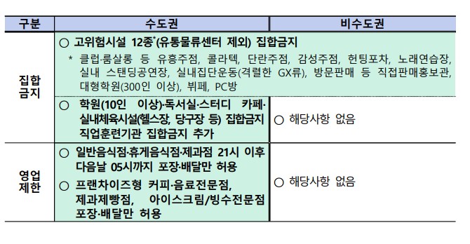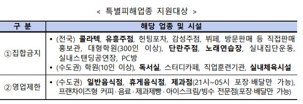 * PC방, 격렬한 실내집단운동 등 고위험시설(전국) + 학원·독서실·실내체육시설 등(수도권) ▪ (영업제한업종) 수도권 음식점·프렌차이즈형 커피전문점 등 영업시간 제한 업종에 대해 지원금 150만원 지급