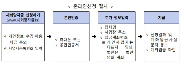 지원 대상자로 확인된 분들은 온라인에서 사업자번호 입력 및 본인인증, 계좌번호 입력 등의 자금 신청만 하시면 됩니다.
