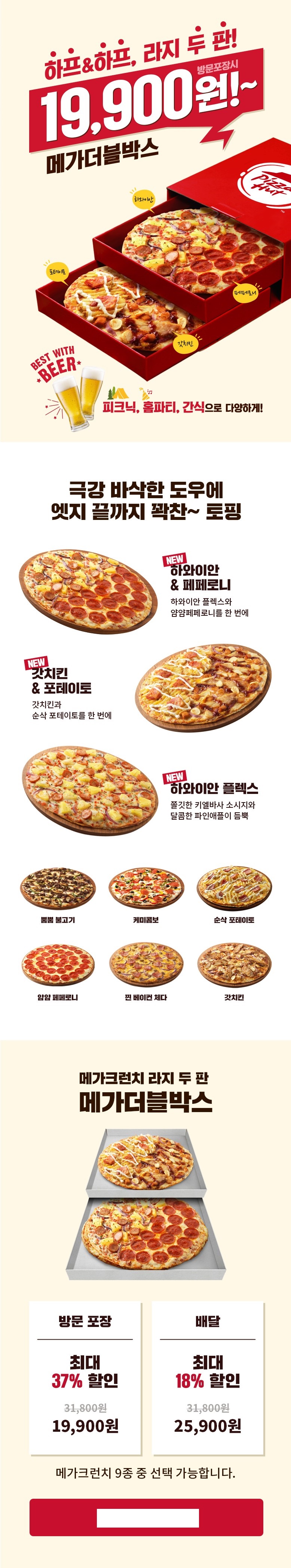 하프 앤 하프 라지 두판을 19900원~ 구매가 가능 합니다. 한번 드셔 보셔도 좋을 맛있는 피자입니다. 방문 포장은 37% 할인 배달은 17% 할인을 해주고 있네요.