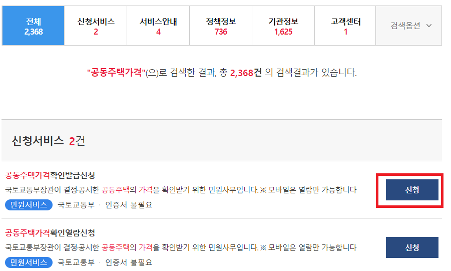 그중에 공동주택 가격 확인서 민원을 선택합니다.