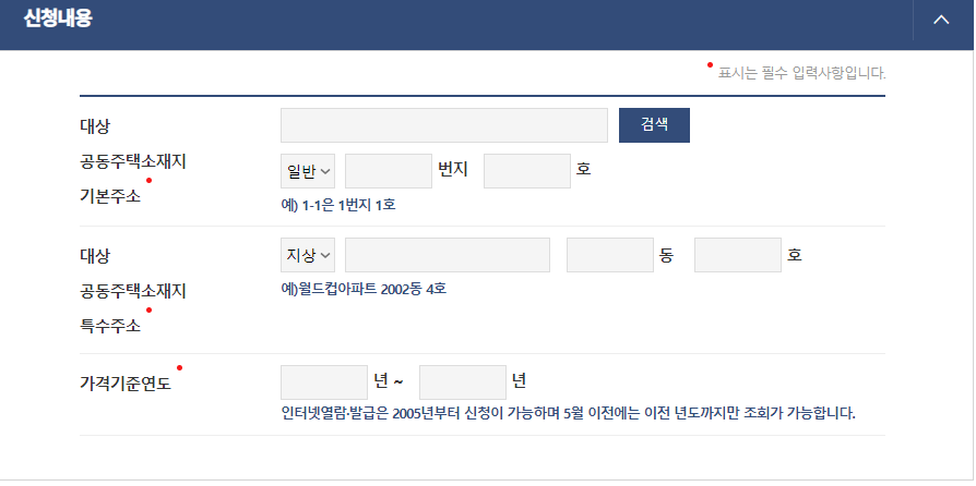 그리고 신청하고자하는 대상의 가격 기준 연도를 입력해 주시면 됩니다.