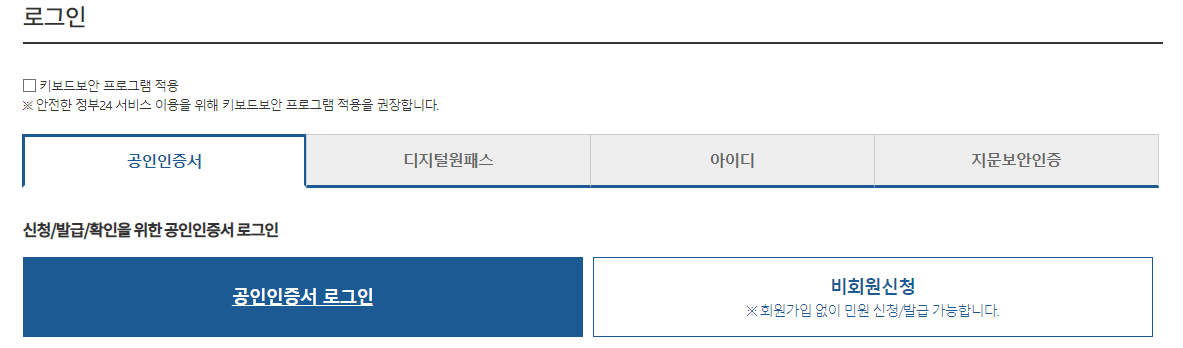 로그인을 해줍니다. 공인인증서를 신청해놓으면 좀 더 간편히 신청할 수 있습니다.