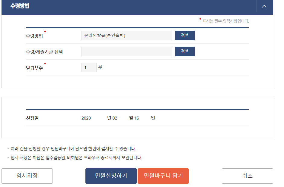 수령 방법은 온라인 발급 본인 출력을 선택 해주시고 수령 및 제출 기관을 선택해 줍니다.