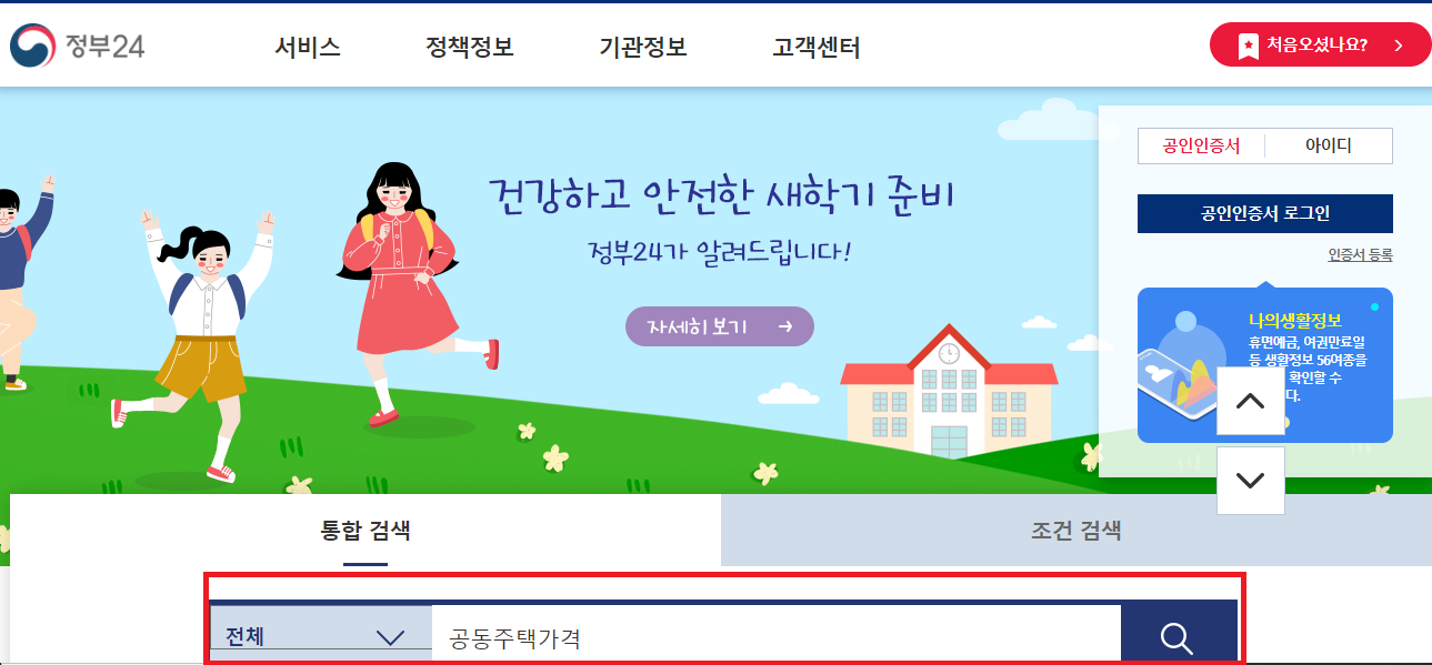 정부 24 웹사이트에 접속해서 검색어 입력란에 '공동주택가격' 입력해 줍니다.