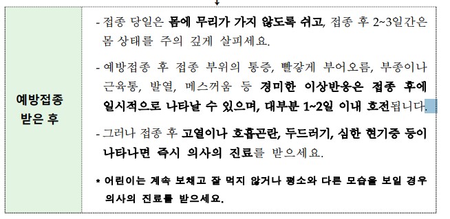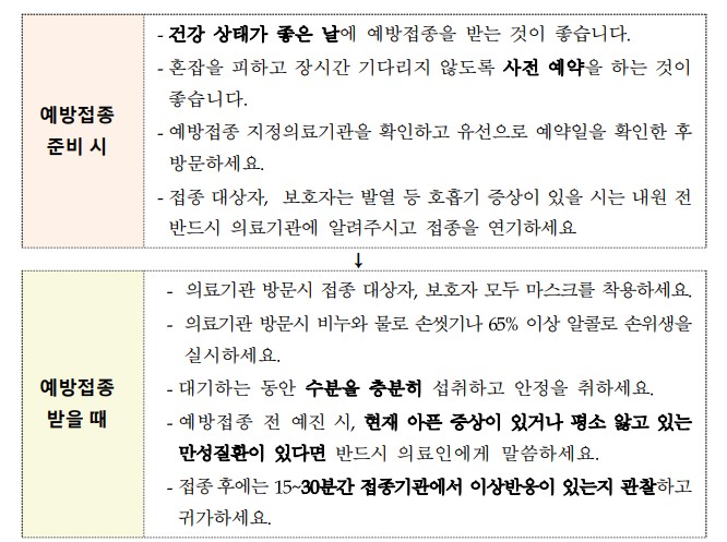 접종 대기 중에는 수분을 충분히 섭취하고, 예진 시 아픈 증상이 있거나 평소에 앓고 있는 만성질환은 반드시 의료인에게 알리고, 접종 후 반드시 의료기관에서 15~30분간 이상반응 여부를 관 찰하는 등 안전한 예방접종을 위한 주의사항을 당부”하였네요.