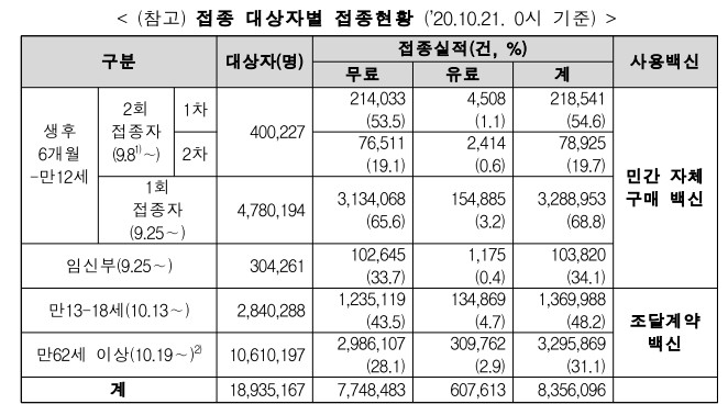 현재 인플루엔자 예방접종 현황은 10월 21일 기준 약 1,297만 건이 등록되었으며, 국가예방접종사업 대상자의 접종건수는 836만건으로 분석되었습니다.