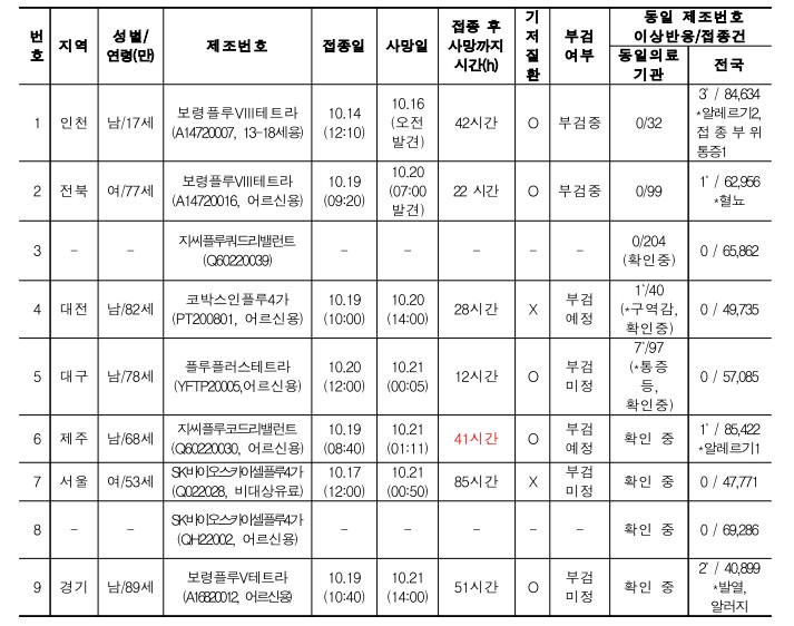 국소반응(33), 발열(18), 알레르기(16), 두통·근육통(7), 복통·구토(4), 기타(6) ) 사망 사례는 총 9*건 보고되어 그 중 7건에 대해 역학조사 및 사인을 밝히기 위한 부검 등이 진행 중이며, 동일 날짜에 같은 의료기관에서 동일 백신 제조번호로 접종받은 접종자에 대해 이상반응 발생 여부를 모니터링 중입니다.