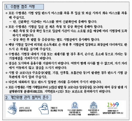 수험생 및 시험 감독관 등 관계자의 체온 측정 및 증상 확인, 마스크 착용, 손소독제 사용 확인 후 입장 허용하네요