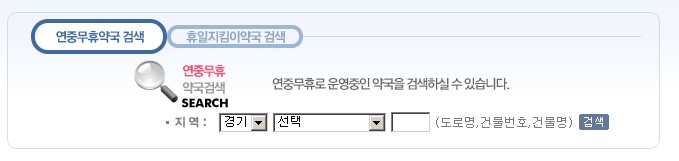 야간시간 (저녁 6시부터 다음날 아침 8시가지 접속 하는 이용자는 메인페이지에서 아래 휴일 지킴이 약국 검색 기능을 사용하면 이용가능한 약국을 검색하실수 있네요. 연중무휴 약국 검색과, 휴일지키미 약국도 검색해 보시면 되네요.
