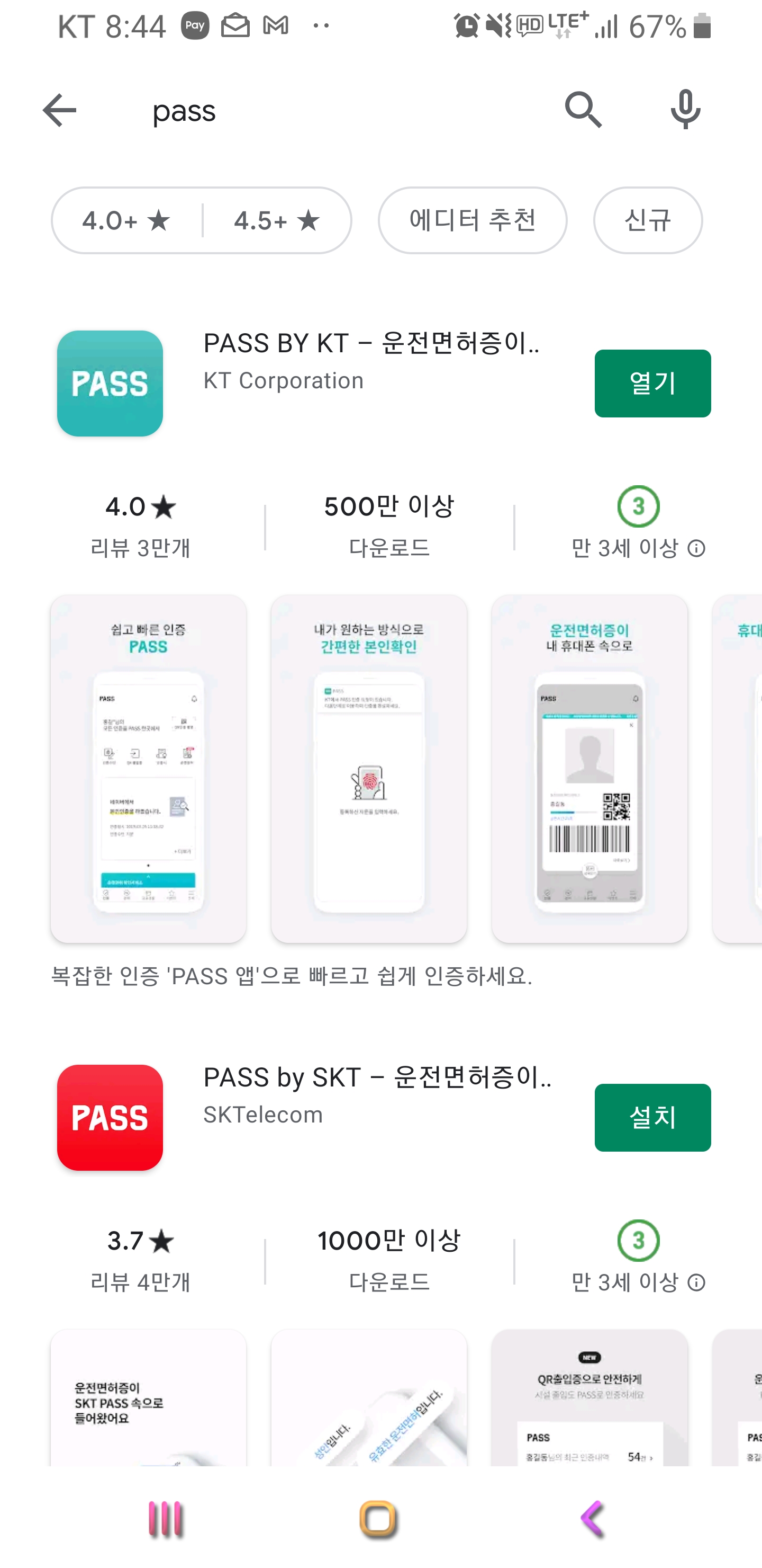이제부터 PASS 인증서 발급 방법에 대해서 자세히 설명 드릴께요. 우선 PASS 인증서를 발급 받기 위해서는 PASS 어플을 설치 해야 하네요. 구글 플레이에서 PASS라고 입력하세요. 입력하게 되면 아래와 같이 PASS 어플을 확인 하실수 있어요 KT용 PASS, SKT용 PASS 중에 본인의 통신사에 맞춰 설치하시기 바래요. 휴대폰 사용해서 휴대폰 앱으로 설치 가능합니다.